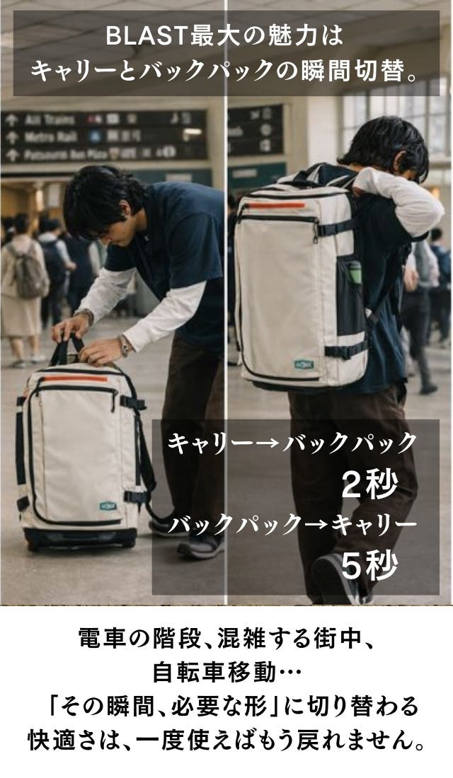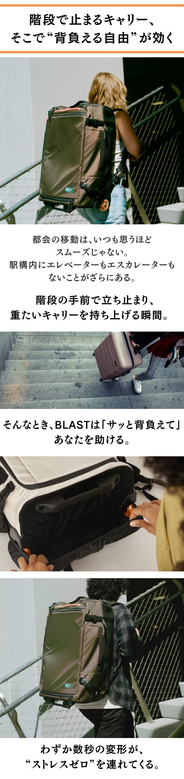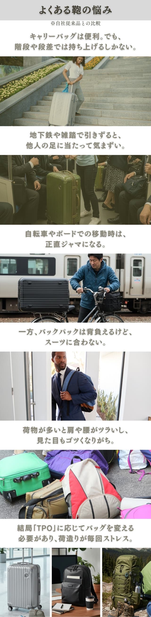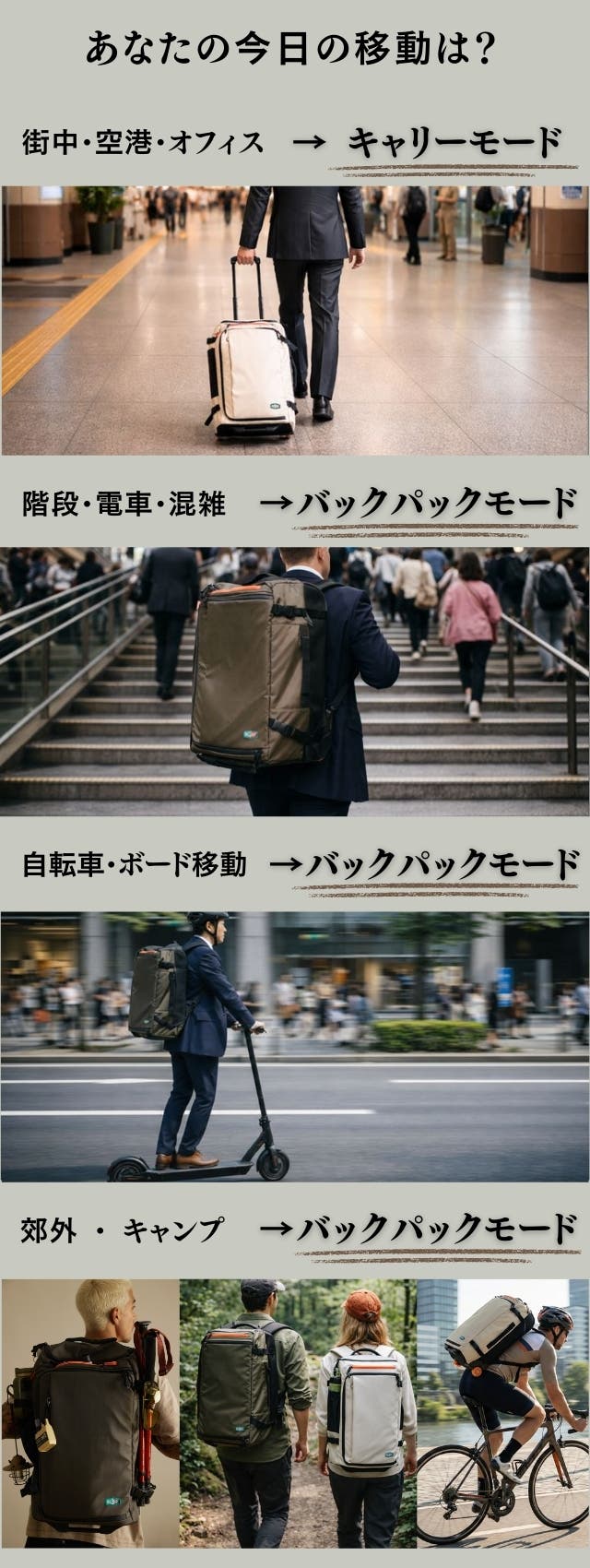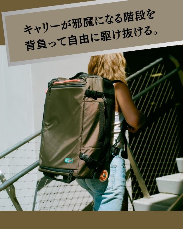 - キャリーが邪魔になる階段を、2秒でバックパックへ。背負って自由に駆け抜ける。