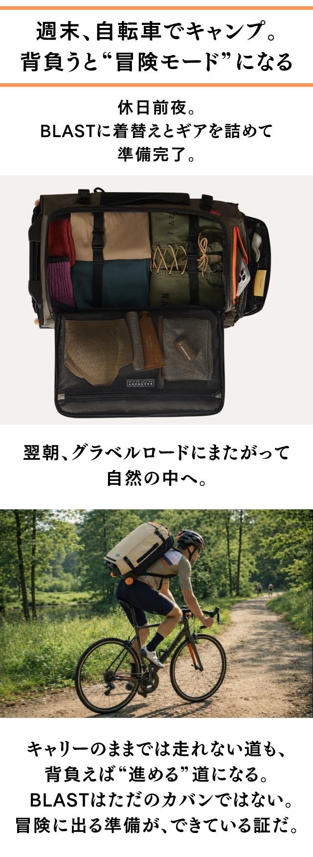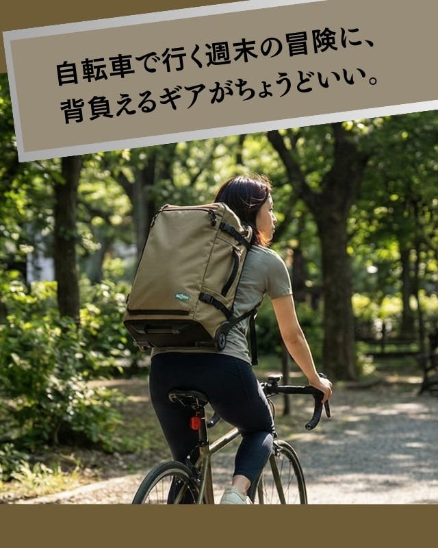 - 自転車で行く週末の冒険に、背負えるギアがちょうどいい。