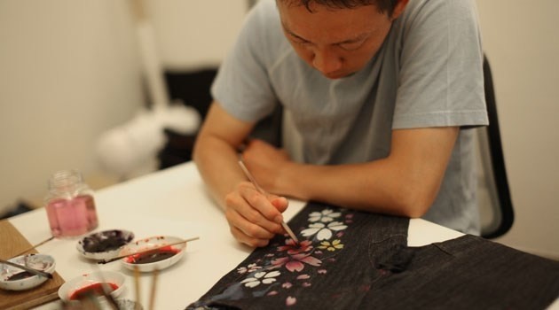 京都デニムの職人が、あなたのご希望に沿ってお好きな柄を入れて差し上げます(大きさはA4一枚程度が上限とさせていただきます)。ジーンズにお柄を染めで入れることは、ジーンズブランドに多く見られるプリントなどと比べると困難が伴います。もともと藍色に染まっているので、そのまま上から染めることはできません。お柄を入れたいその形にまずは藍色の色を手作業で抜きます。そしてその上から友禅染めと同じく、手作業で色を挿します。