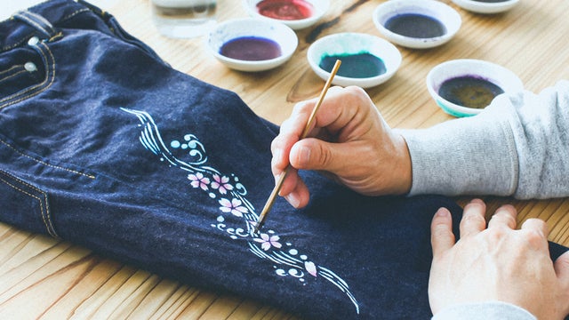 京都デニムでは 本来着物に施す「伝統工芸京友禅染め」の技法を応用して、デニム生地に色付けをしています。デニムの糸自体が染料で染まるため、プリントとは違い鮮やかな柄や色が剥がれ落ちることはありません。