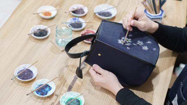 昔から着物で使われてきた技法を使って、それぞれの季節の文様を描いていきます。日本人が昔から大切にしている四季をサコッシュバッグに描きました。