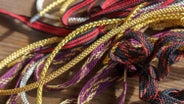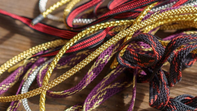 京くみひもは、帯じめなどに使用され、着物の装飾品として親しまれてきました。組台を使う手仕事で、量産品ではないことが魅力の1つです。