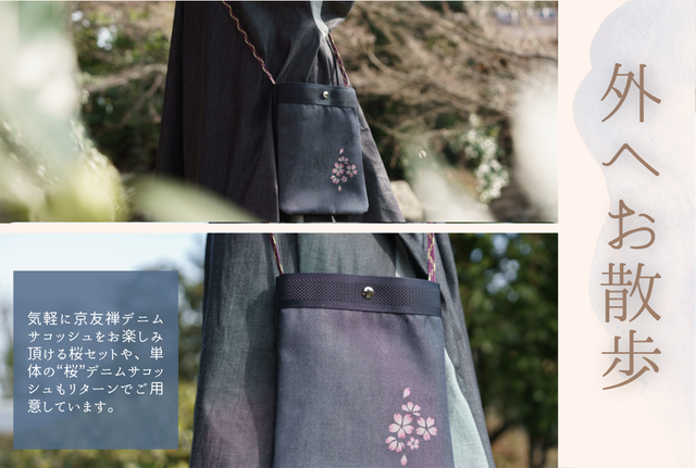 今回は、家でも外でも、共に過ごす時間が好きになる、そんな京友禅染めを施した"桜"デニムサコッシュを一般発売に先駆け、Makuakeにて販売致します。