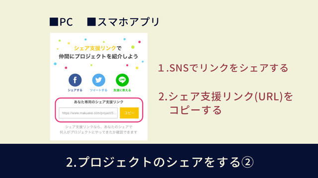 2-2. FacebookやTwitterアイコンから、シェア支援する。もしくは、シェア支援リンクをコピーして、その他SNSに投稿したり、直接リンクを送って、シェア支援します。
