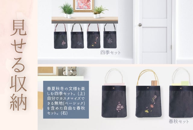 春夏秋冬の文様が描かれたバッグ。(左から春・夏・秋・冬)