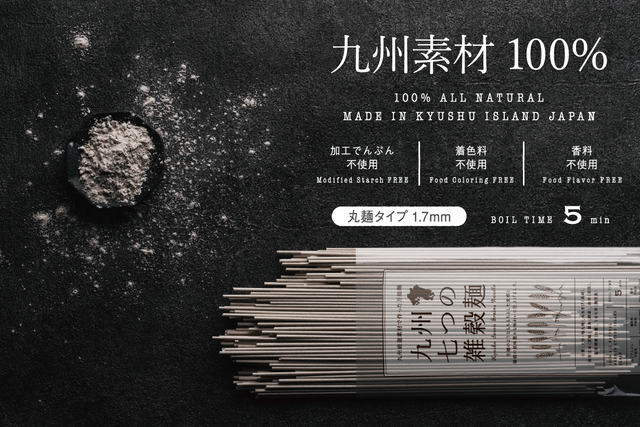 創業120年、長崎県南島原にある老舗製麺所「小林甚製麺」さんと共に、「九州の大地が育んだ美味しさを届けたい」という想いで、100%九州産の素材を使用した7種の雑穀入り万能麺を作りました。