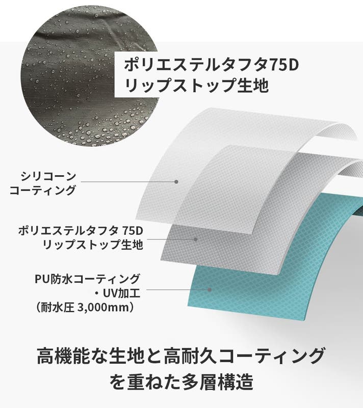 ・本体:100%ポリエステルタフタ75デニールリップストップ、シリコンコーティング、耐水圧3,000mm、防水コーティング、撥水コーティング、紫外線遮断コーティング