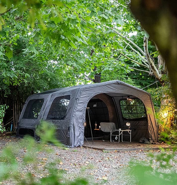 曇天・雨の日も明るく開放的。テント本体とのカラー・素材・デザインが完全に調和し、拡張後もミニマルで美しいキャンプサイトを演出します。