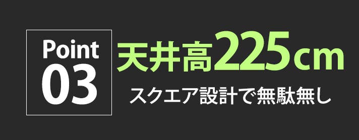 - 【空間効率抜群】スクエア構造&天井高225cmで、かがまず・大人数でもゆったり過ごせる空間