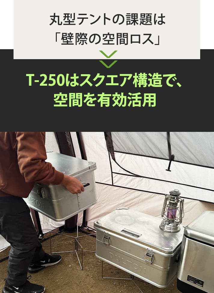 多角形テントで生まれがちなデッドスペースを徹底排除。コットやラックを効率的に配置し、空間を最大限に有効活用できます。