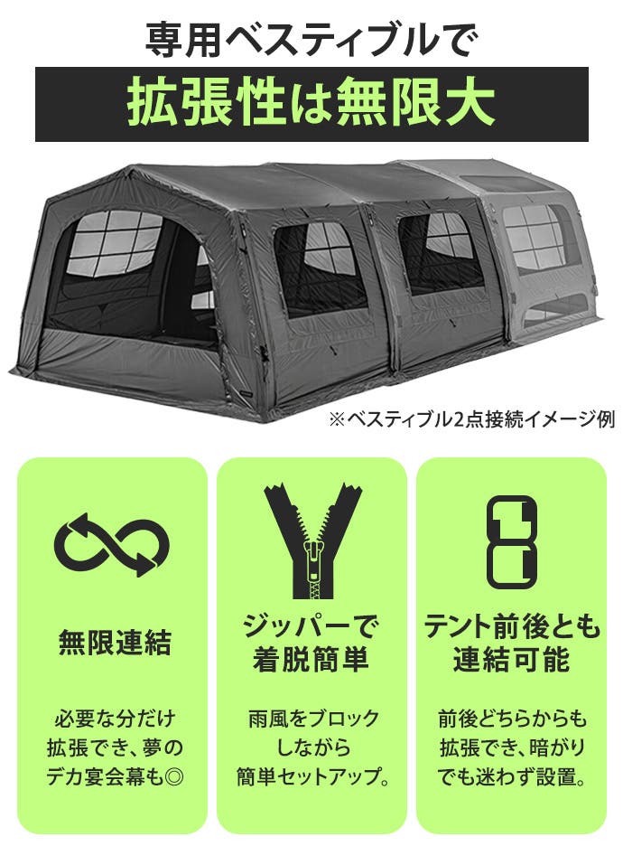テント本体にファスナーで連結! 1点連結で居住空間を約2倍に拡張します。