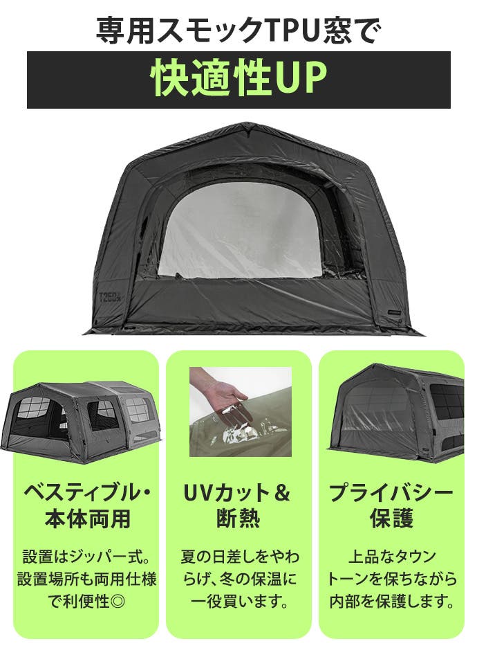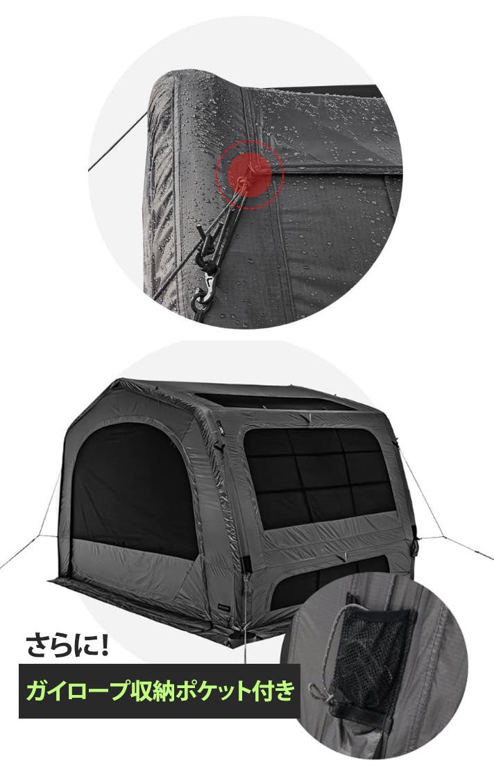 また、シリコーンコーティング・軽量TPUエアビーム構造が重量を抑えながら、エアテントで心配されがちな破裂や裂傷を防ぐ強度を保ちます。