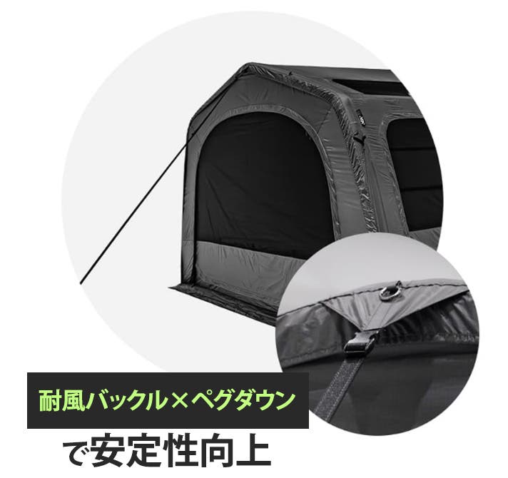 バックルを用いたペグダウンで強風を受けてもテント全体が安定し、突風による揺れや横ぶれを効果的に抑えます。