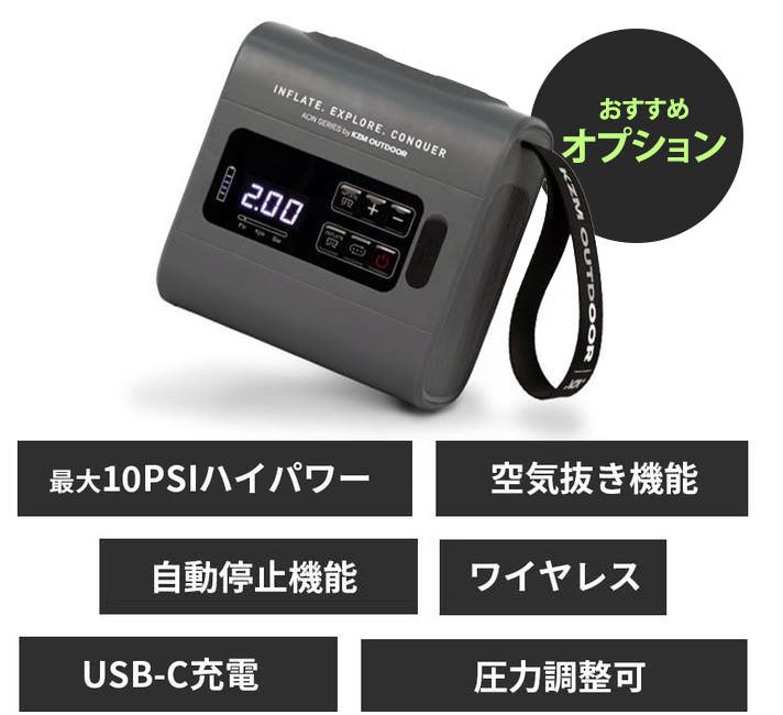 さらに別売りの全自動エアポンプをご利用いただきますと、細かい圧力設定と自動停止機能があるため、過度な空気の入れすぎを防ぐことができます。