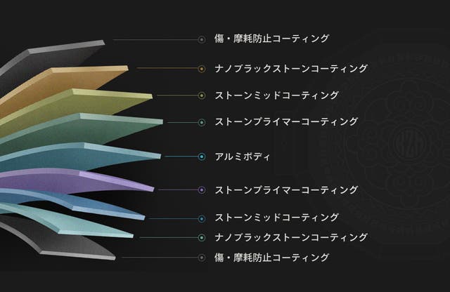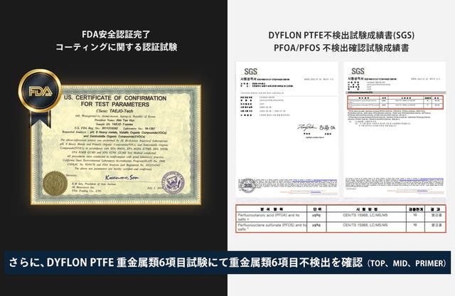 表面の耐食性と耐摩耗性に優れたメガストーンコーティングをはじめ、各層とも人体に有害な成分PFOA※や重金属類6項目※の不使用を検査済です。