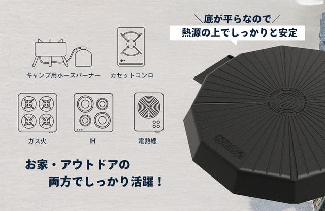 ●焚火・炭火・ストーブなど火力や置き場が不安定な熱源で使用しないでください。●熱源の形状、種類によっては傾きや落下する場合があり、やけどする恐れもありますので、十分にご注意ください。なお、調理するときは熱源の中央に本体が位置するように置き、安定を確認したうえでご使用ください。