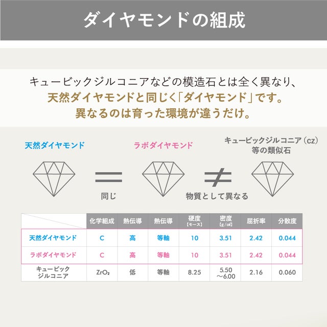 天然ダイヤモンドとラボグロウンダイヤモンドは同じ「ダイヤモンド」でありながら、生まれ育った環境が違うだけの新しいダイヤモンドです。