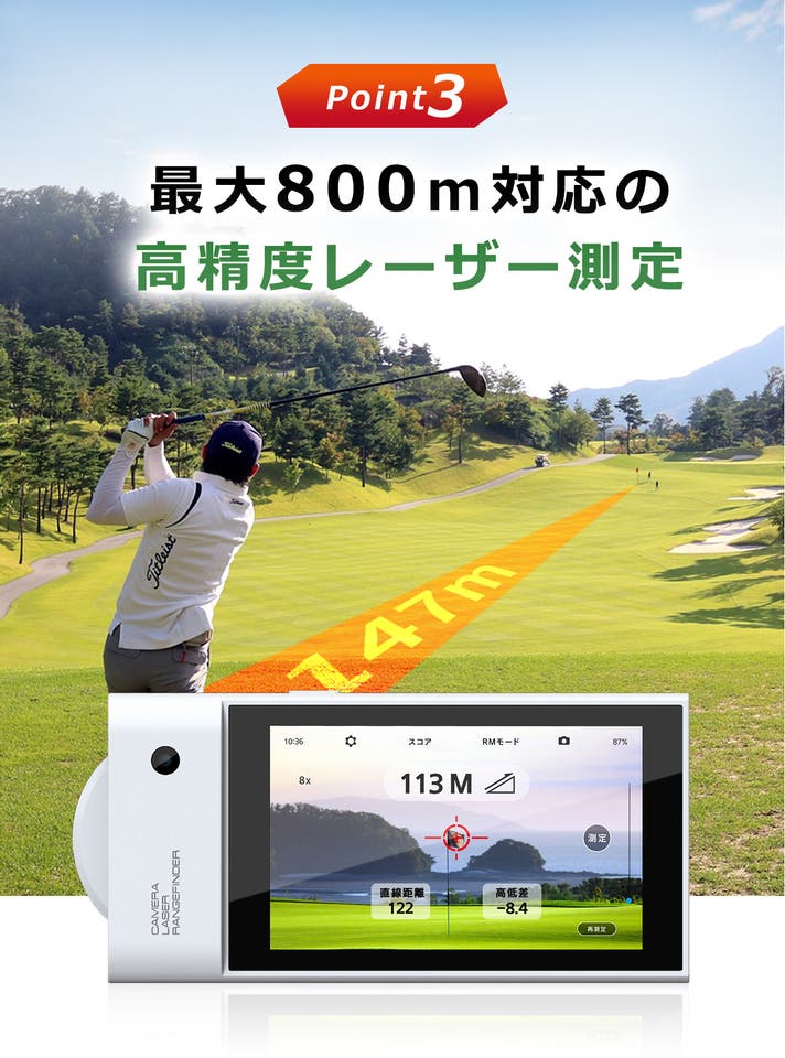 高性能レーザーにより、誤差±1m・最大800m(約875ヤード)まで測定可能。
