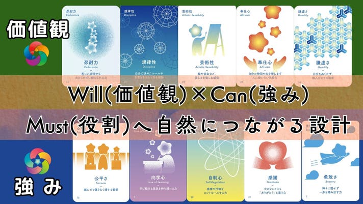 このカードは、個人の価値観(Will)と強み(Can)を明確にし、組織の役割(Must)と結びつけるためのツールです。