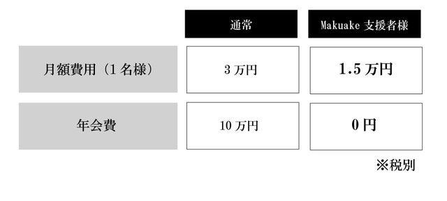 - 特別にお試しプランを用意。今支援すると通常年会費10万円、月会費3万円が今後も1.5万円に。