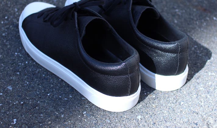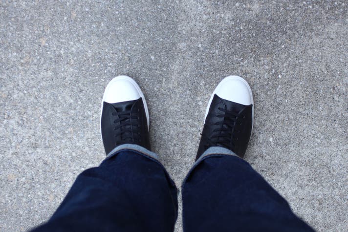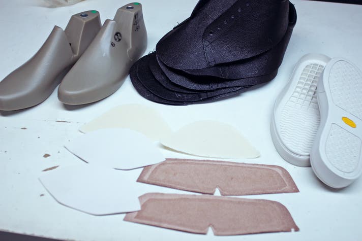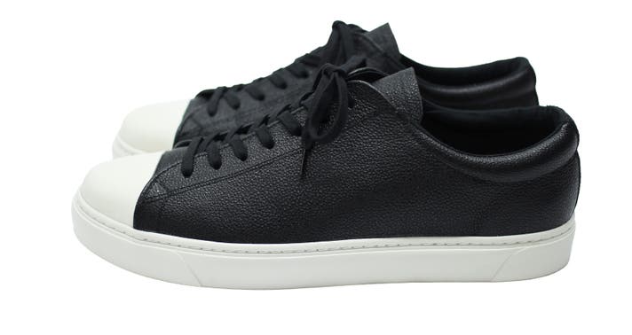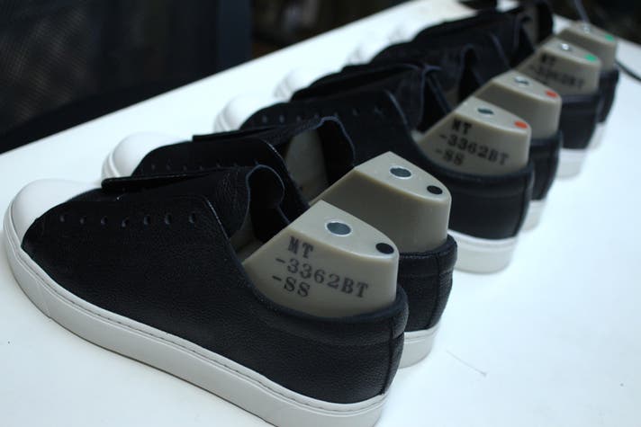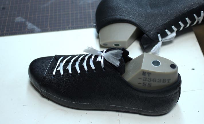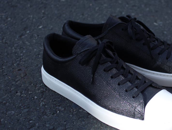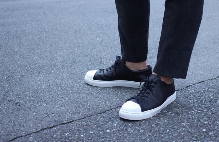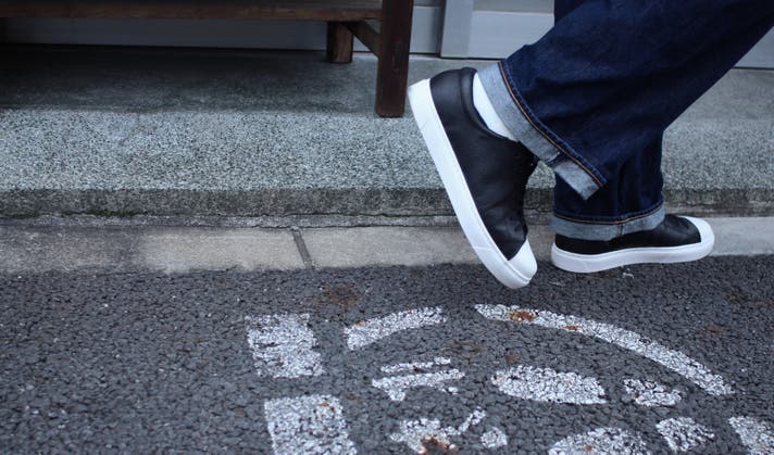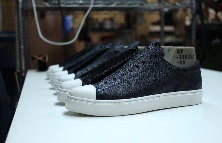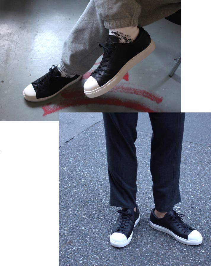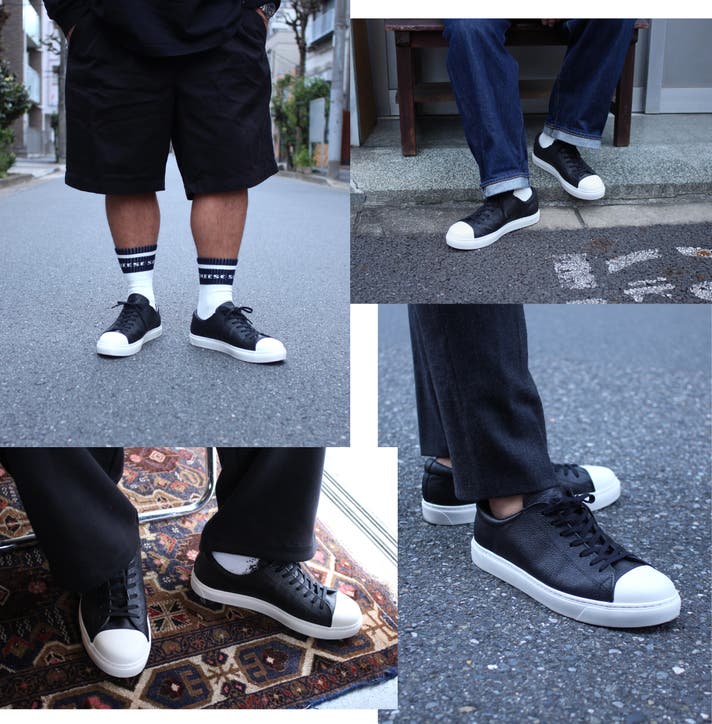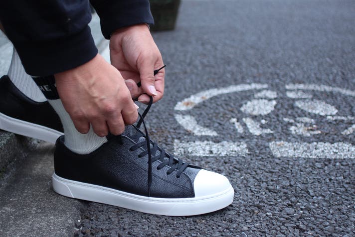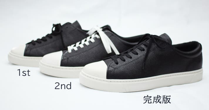 専門知識0で靴作りの難しさがわからないからこそ、この黒桟革を使ったレザースニーカーの発想に行き着いた私たち。