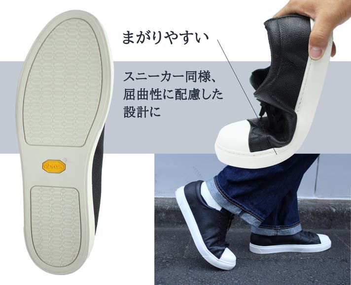 見た目はドレスシューズのような上品さを持ちながら、履き心地はスニーカーそのもの。スーツスタイルに合わせても違和感がなく、休日のカジュアルにも自然に馴染みます。