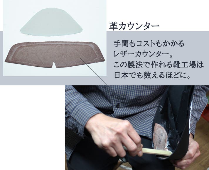 靴の踵部分に内蔵されている“カウンター”は、かかとを保護し、歩行を安定させる、そして靴の型崩れを防ぐという重要な役割を担う大事な部品。