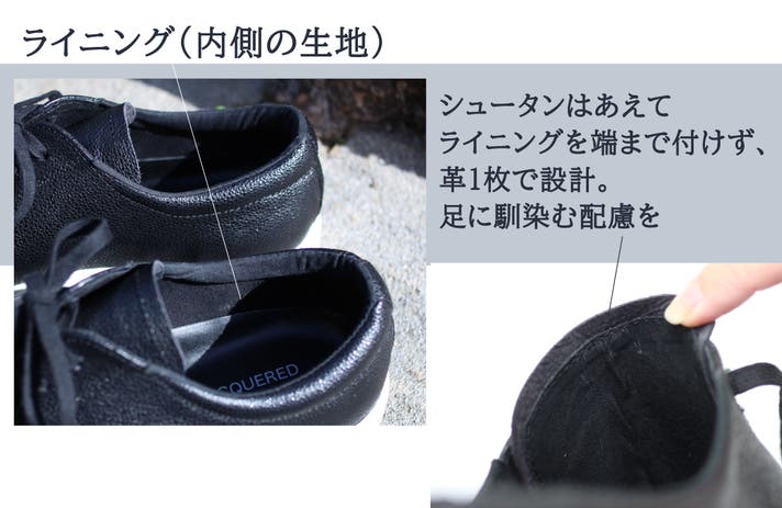 靴の内側(=ライニング)に抗菌防臭効果のある綿オックス生地を使用。