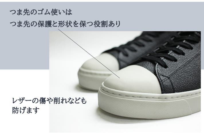 つま先にはゴム製のトーキャップを使用し、つま先の保護や靴の耐久性を高めました。底と色を合わせているので悪目立ちせず、スマートな印象に。