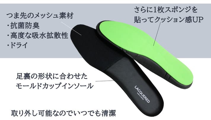 足裏のアーチに合わせたカップインソール形状に、裏面にはさらに約3mm厚のEVA素材のスポンジを合わせてクッション感をアップ。