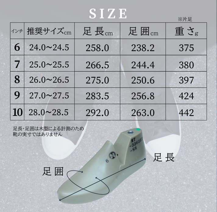 ※靴には「捨て寸」という余裕分がつま先に1cm程度あります。ご自分の足の計測サイズよりも1cm程度大きいサイズをお選びください。