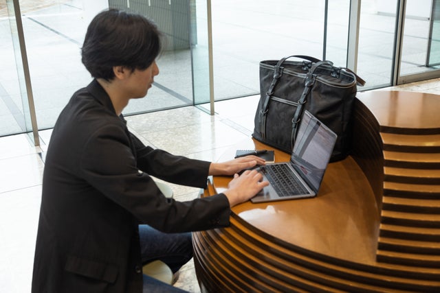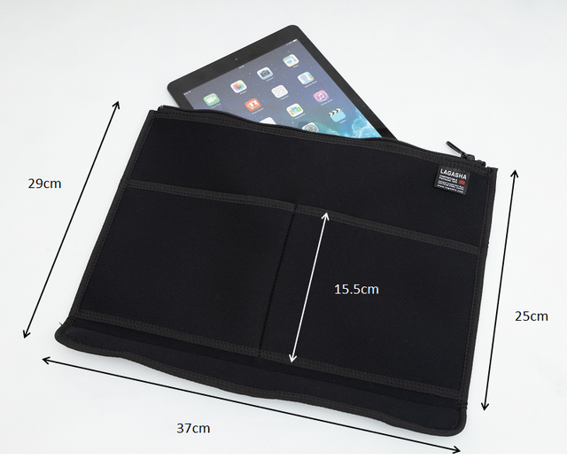 アウトポケット2個付きで、メインファスナーからA4クリアファイル、13インチPCやタブレットも収納可能です。