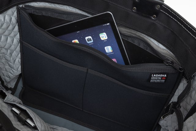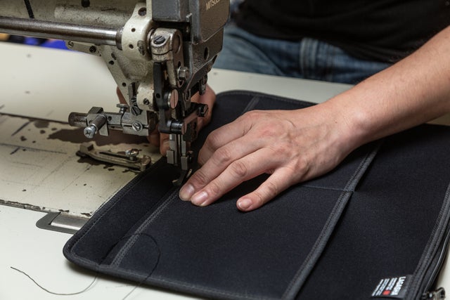 荷物を優しく保護するため、ナイロン高密度タフタに厚めの60gの綿ボンディングをし、キルティング加工を施しました。通常のキルティング加工ではクリアファイルの角などでキルトの糸がきれやすいため、糸を切れにくくするためコンピュータキルト加工を採用しています。コンピュータキルト加工は縫製のピッチが細かくなるため、引っかかりにくく強度が増します。
