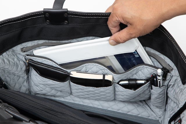 手帳、名刺入れ、スマートフォンが入れられるサイズのクイックアクセスポケット。