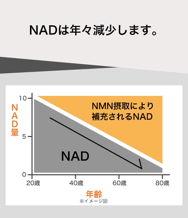 残念ながら、NADのレベルは年齢と共に減少します。そこで、NMNを補充することが重要になります。NMNを摂取することで、NADを増加させることが期待できます。