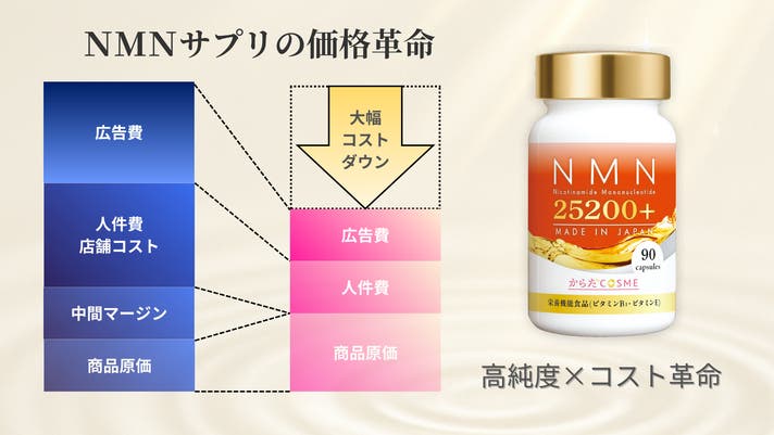 このたび、みなさまへの感謝とさらなるご期待にお応えすべく、価格・品質・実感力すべてにおいて進化させた新商品【NMN 25200+】を開発いたしました。