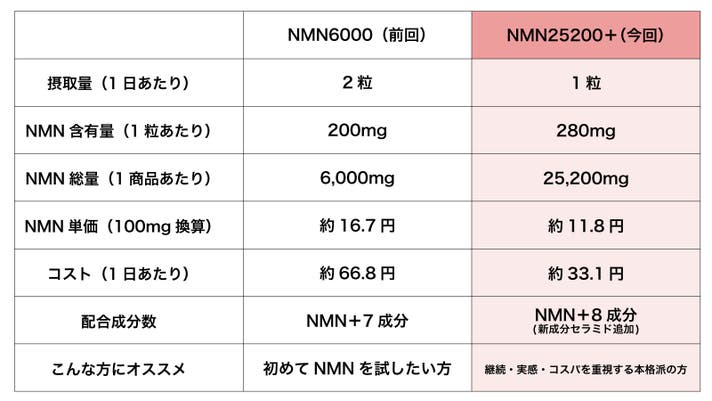 【NMN 25200+】は、前作NMN 6000でいただいた多くの応援とフィードバックをもとに、価格・成分・設計すべてにおいて丁寧に開発した商品です。
