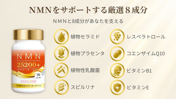 【NMN 25200+】はNMNに加えて、NMNと一緒に摂りたい8種類の厳選成分を配合しました。NMNと8成分を組み合わせた一粒が、自分らしい美しさをサポートします。