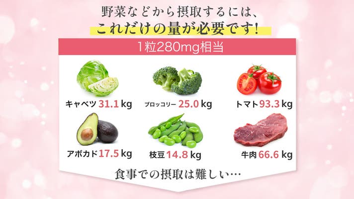 例えば、NMN 280mgを摂取しようとすると、トマトなら約93kg、牛肉なら約66kgに相当します。