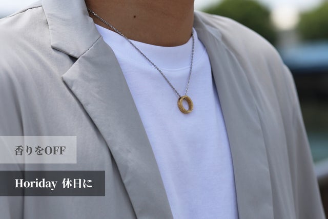 香水を直接ネックレスにつけることから、シーンに応じて、ネックレスの取り外し(香りのON/OFF)が楽しめるのも、このネックレスの特徴。