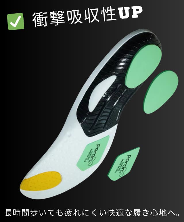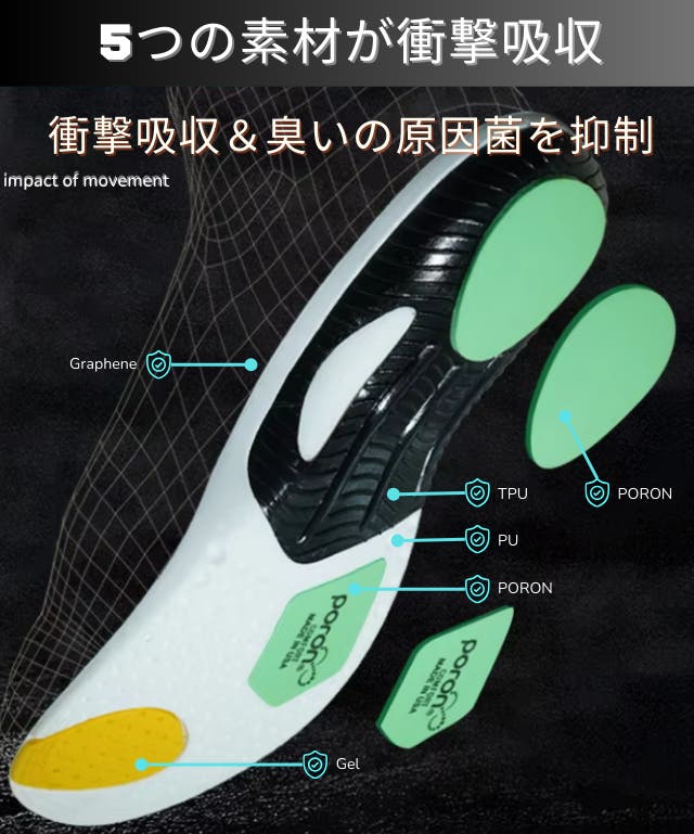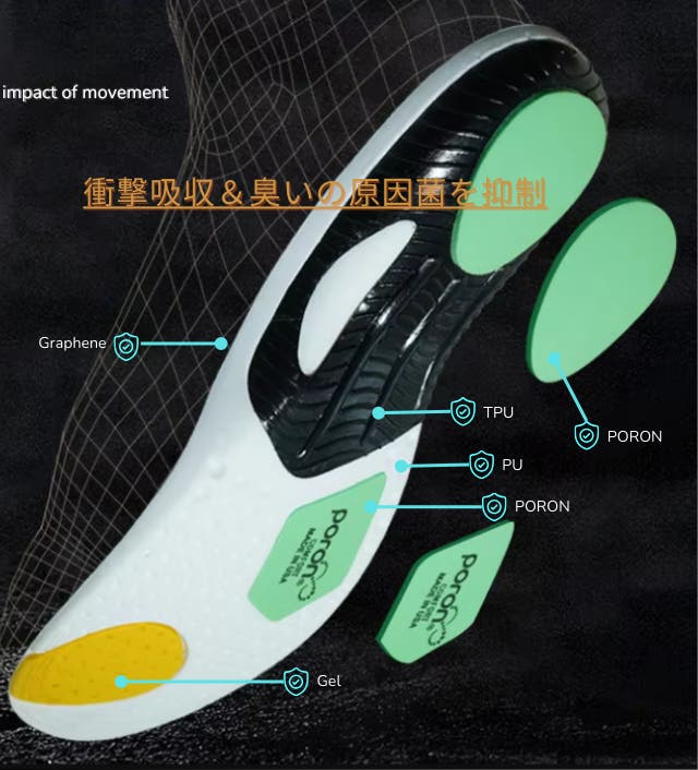 - 【1歩で体重の1.5倍の衝撃】5つの衝撃吸収素材のインソールが足裏にかかる衝撃を吸収!