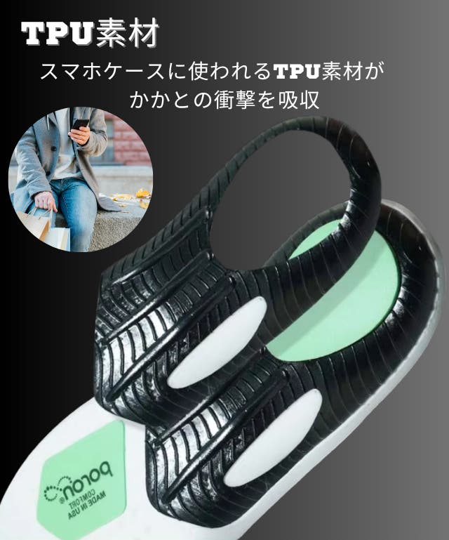 - スマホケース素材がかかとの負荷を軽減|ヨガマット素材が足にかかる圧力を分散|転倒防止ゲル素材
