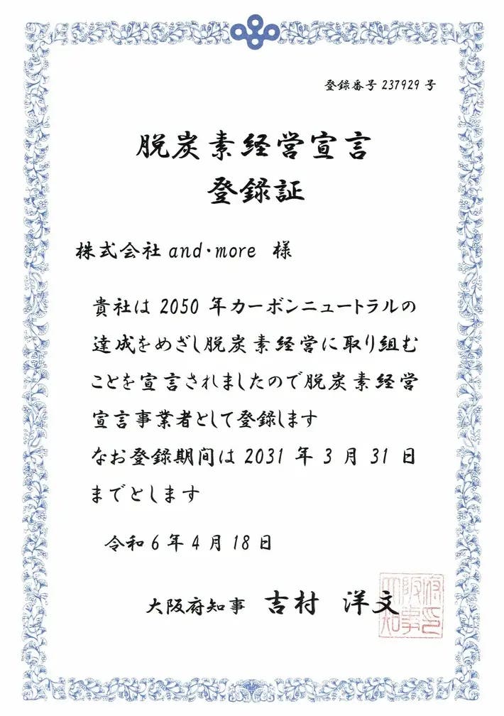 大阪府が、2050 年のカーボンニュートラルの実現に向けて脱炭素化を促進している「脱炭素経営宣言」に登録されました