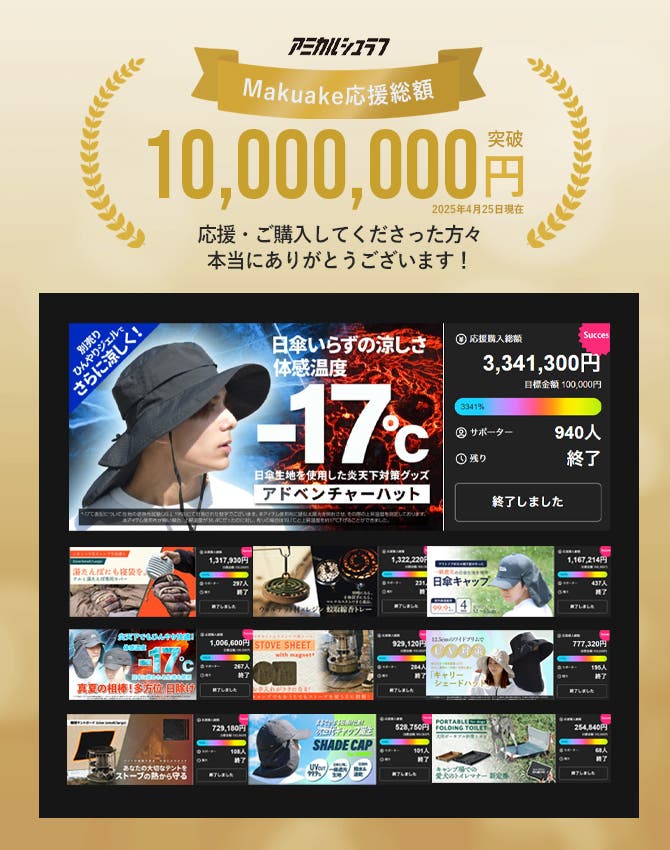 「Makuake(マクアケ)」は、実行者の想いを応援購入によって実現するアタラシイものやサービスのプラットフォームです。このページは、 ファッションカテゴリの 「風で飛びにくく、通気性にも配慮した設計です!夏の強風でも快適に過ごせる優秀帽子」プロジェクト詳細ページです。