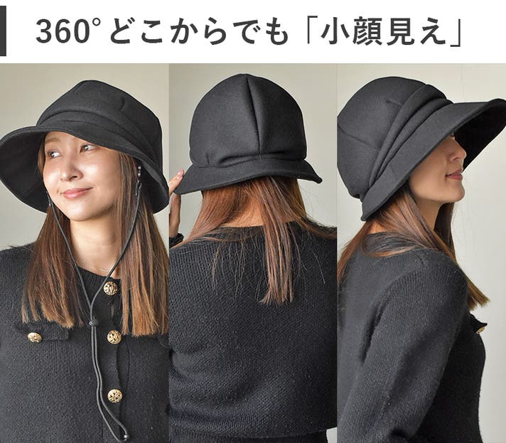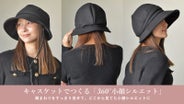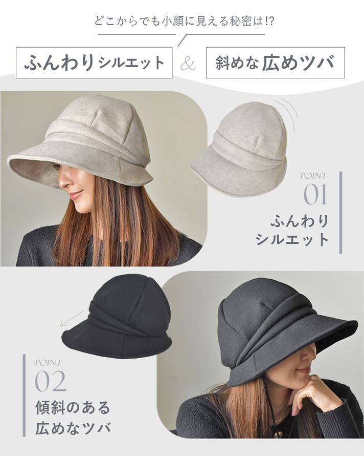 このキャスケットの小顔見えの理由は、ふんわりとした立体感と、顔まわりをすっきり見せる斜めに広がるツバにあります。頭の形をふんわり包み、顔まわりに自然な陰影を作ることで、360°小顔見え に。