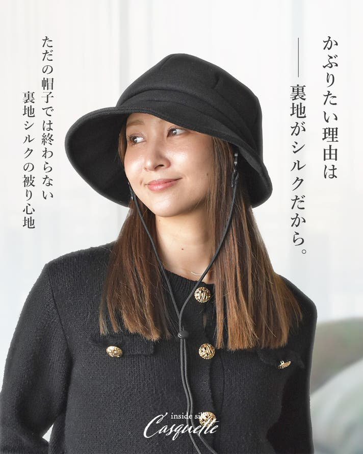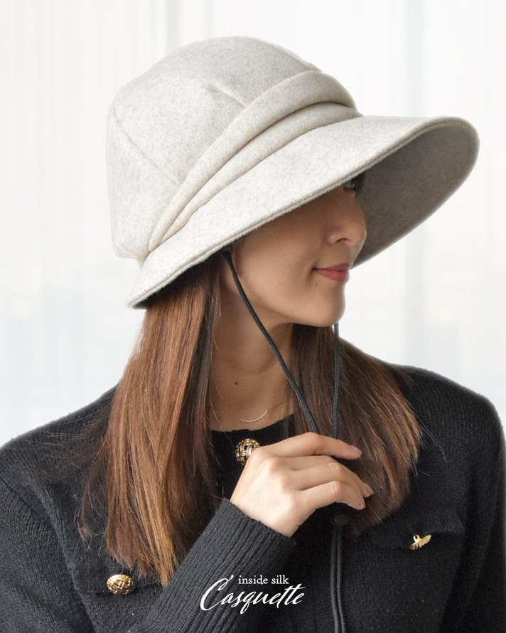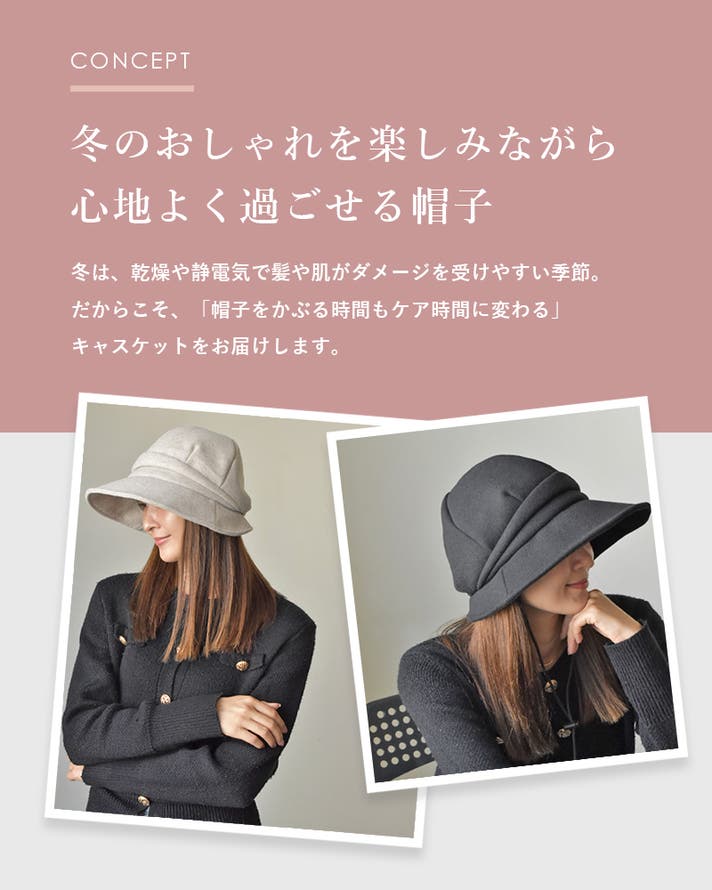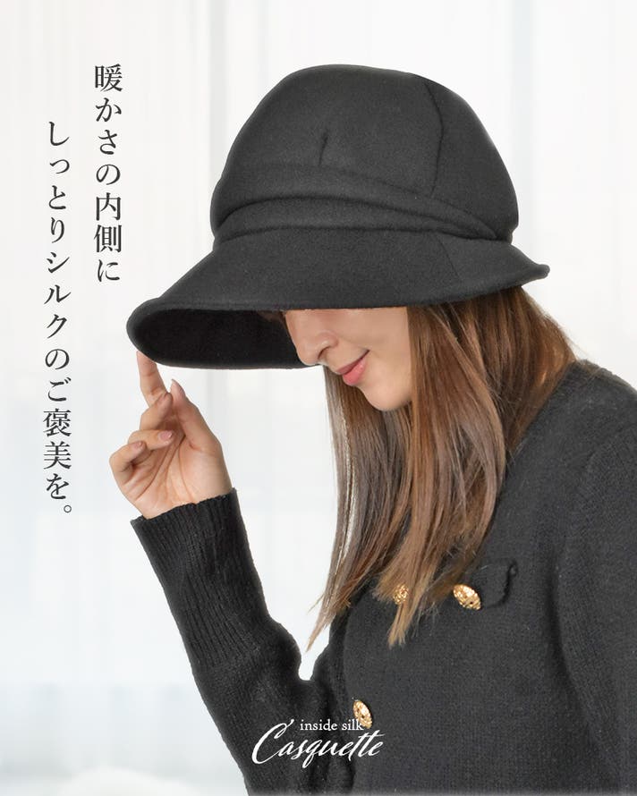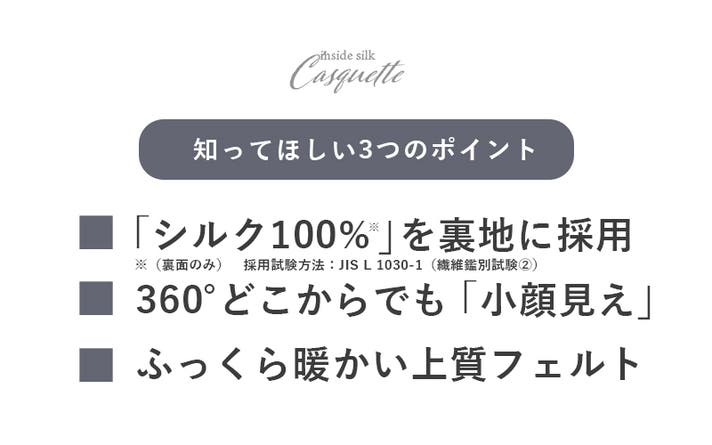 形は、大人の女性でも日常に取り入れやすいキャスケットに。外側は秋冬らしい温かみのあるフェルト素材、内側は贅沢に シルク100% (※裏面のみ 採用試験方法:JIS L 1030-1(繊維鑑別試験②)を使用。毎日の装いに自然になじみながら、かぶるたびに心地よさを感じていただけます。
