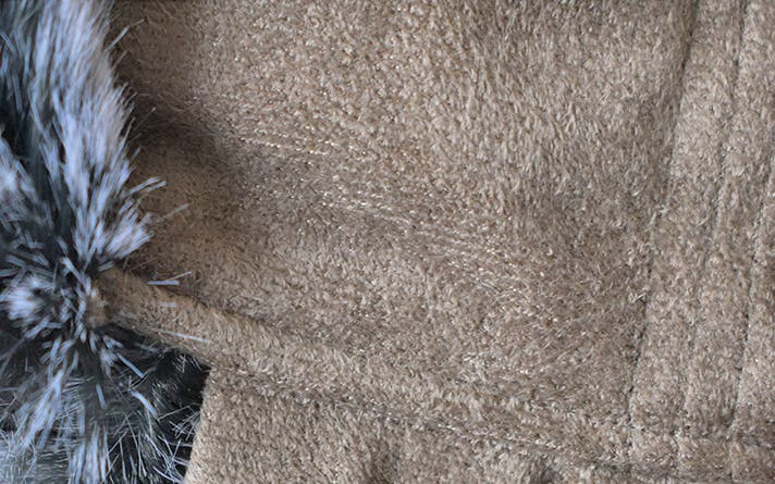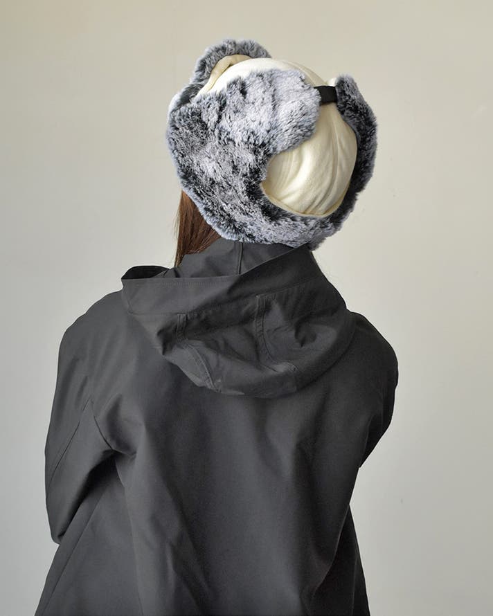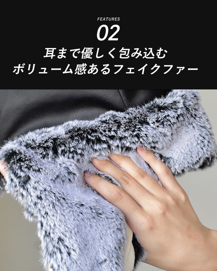 - ふわふわフェイクファーが顔周りにボリューム感をプラスし、かぶるだけで自然に小顔効果を演出
