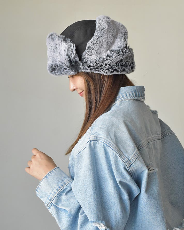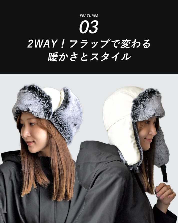 イヤーフラップ部分には、ふわふわでボリューム感のあるフェイクファーを使用。冷たい風をしっかり遮り、耳元を保温してくれるので真冬の外出も安心です。軽量で蒸れにくく、長時間かぶっても快適。天然ファーに比べてお手入れも簡単で、水や汚れにも強いため、デイリー使いに適した実用性の高い仕様です。