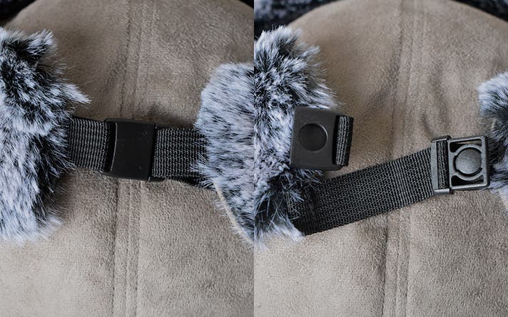 イヤーフラップは、簡単に取り外しができるボタン式バックルを採用しています。着脱はスムーズで、外出中でも手軽に調整できます。気分やスタイルに合わせてフラップをあげてすっきりとしたシルエットにしたり、寒い日には再度取り付けて耳元をしっかり保温したりと、自由にアレンジ可能です。