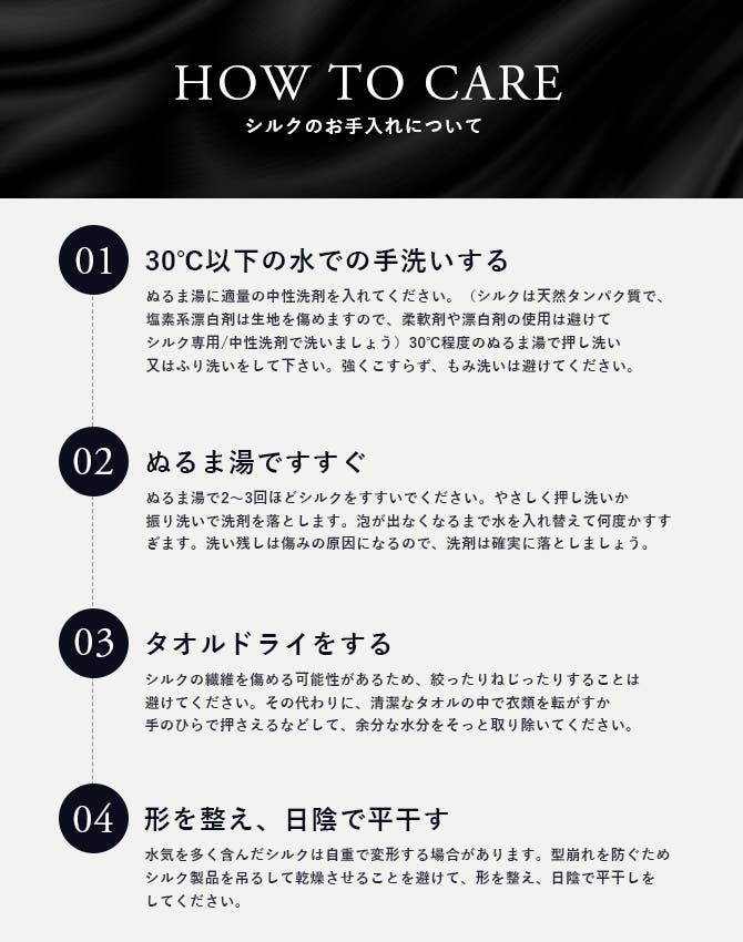 シルクは、蚕の繭からつくられる天然繊維で、そのなめらかな質感と上品な光沢から、古くから高級素材として親しまれてきました。薄くて軽やかなのに、ほどよい保温性と通気性をあわせ持ち、季節を問わず心地よく使えるのが特長です。また、化学繊維に比べて 静電気が起きにくい といわれており、さらりとした着用感を楽しめます。使い込むほどにやわらかさが増し、自然素材ならではの風合いの変化も魅力のひとつです。